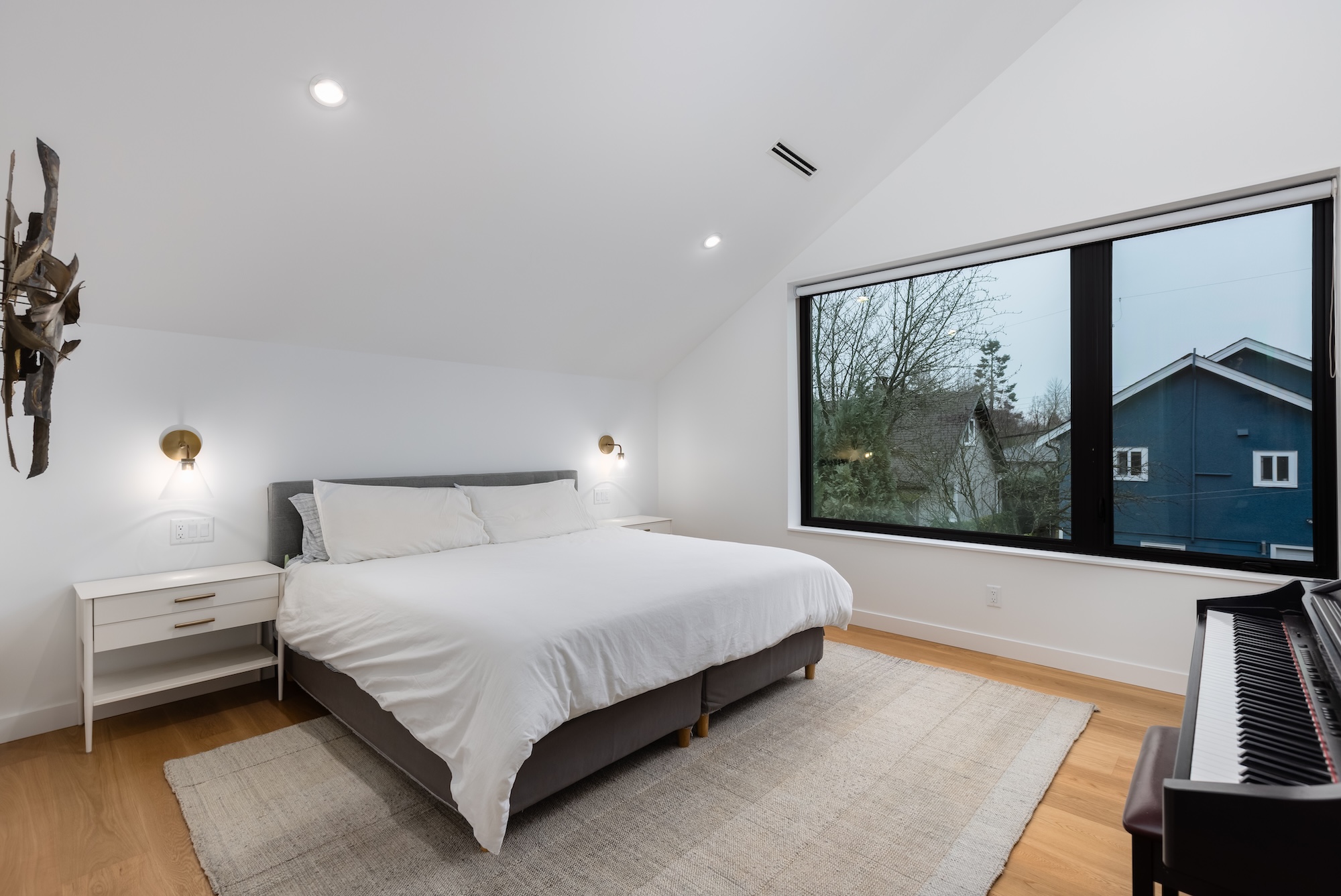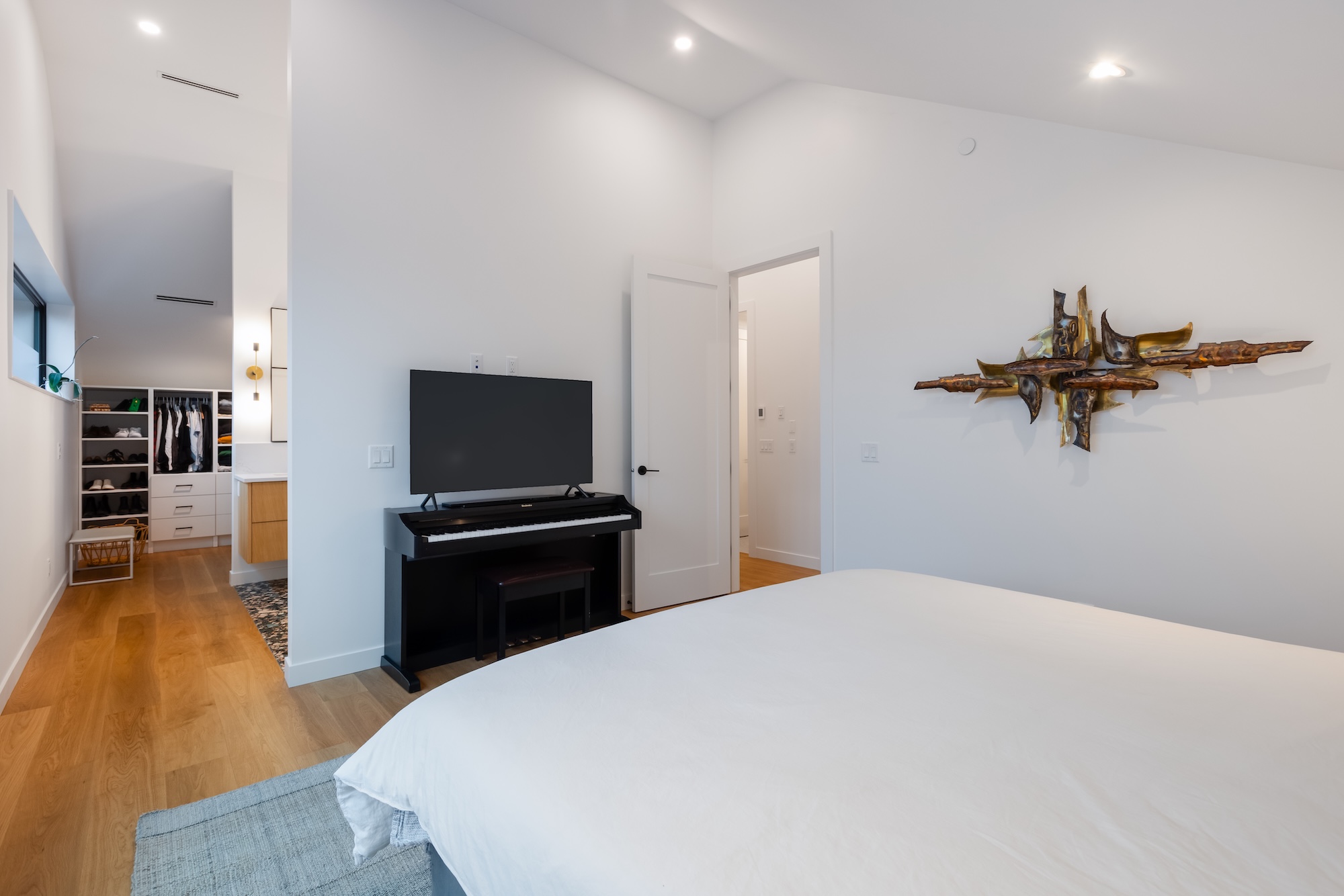 The primary bedroom features a vaulted ceiling that increases both perceived and functional volume, allowing:
