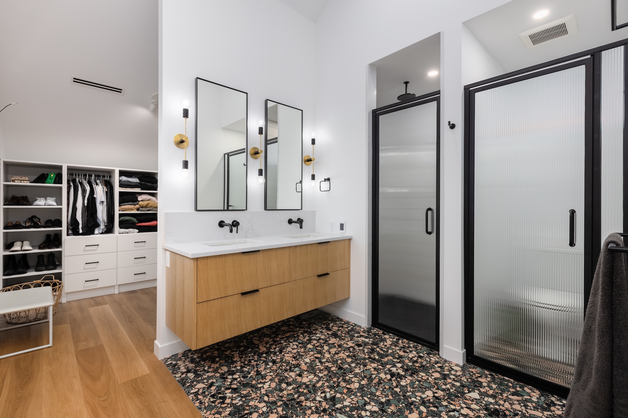 The ensuite and walk-in closet are arranged in a semi-open concept — unique for most homes — while maintaining privacy through obscured glass for the water closet and shower.