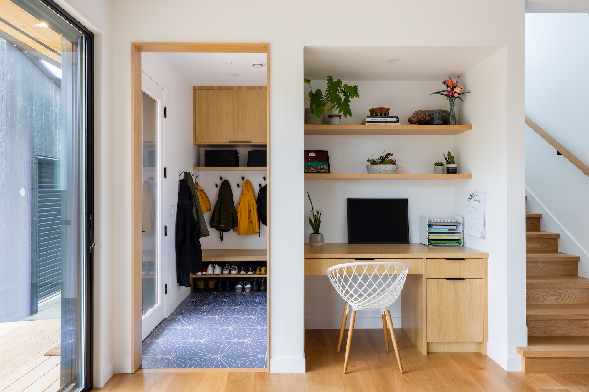 - Custom built-in desk for a study nook, integrates seamlessly into the living area