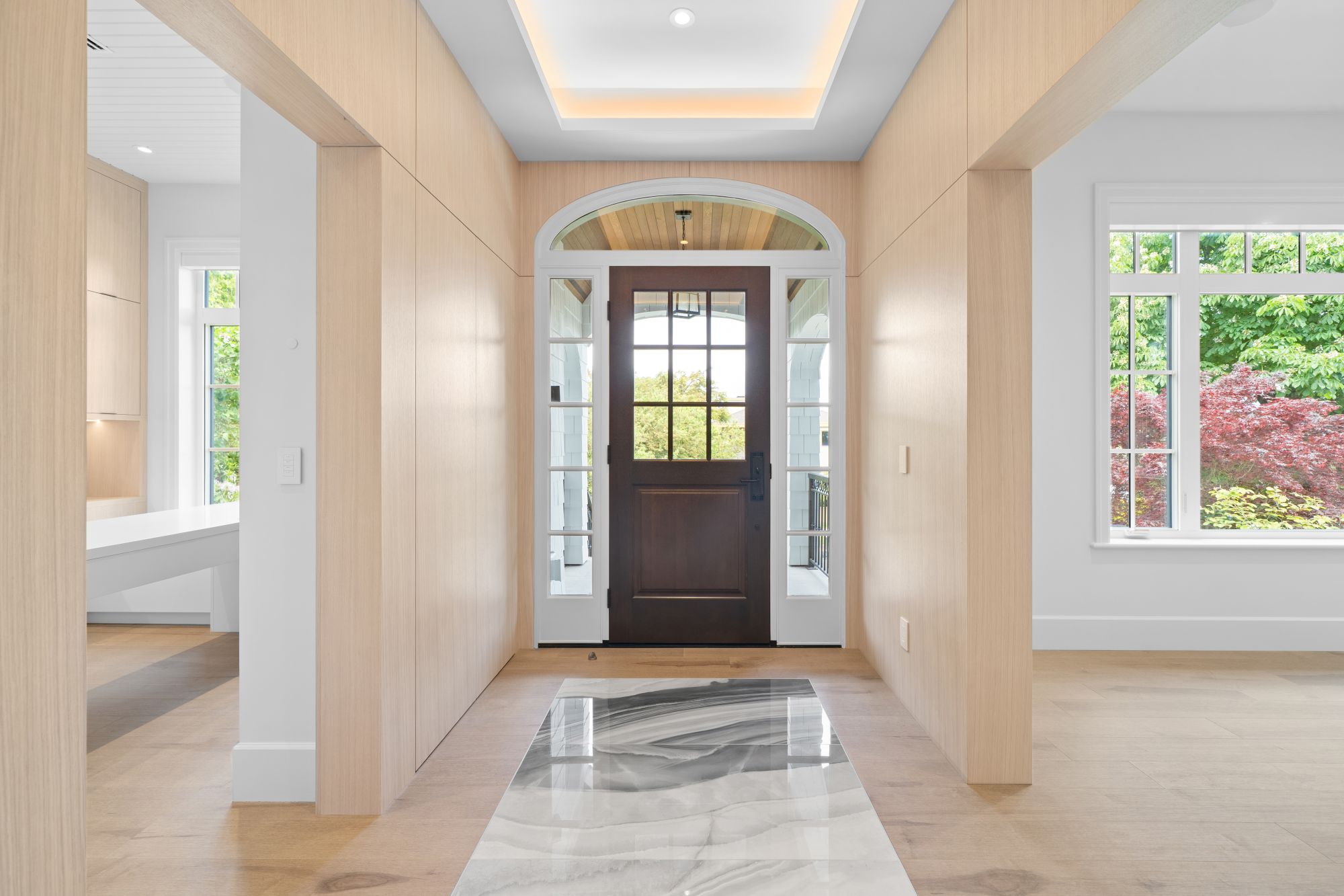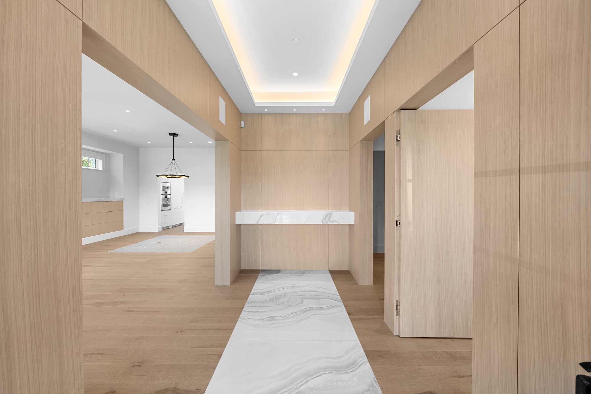 - A grand entryway that creates an immediate sense of quality and welcome, featuring custom millwork, expansive tile, and a striking stone countertop