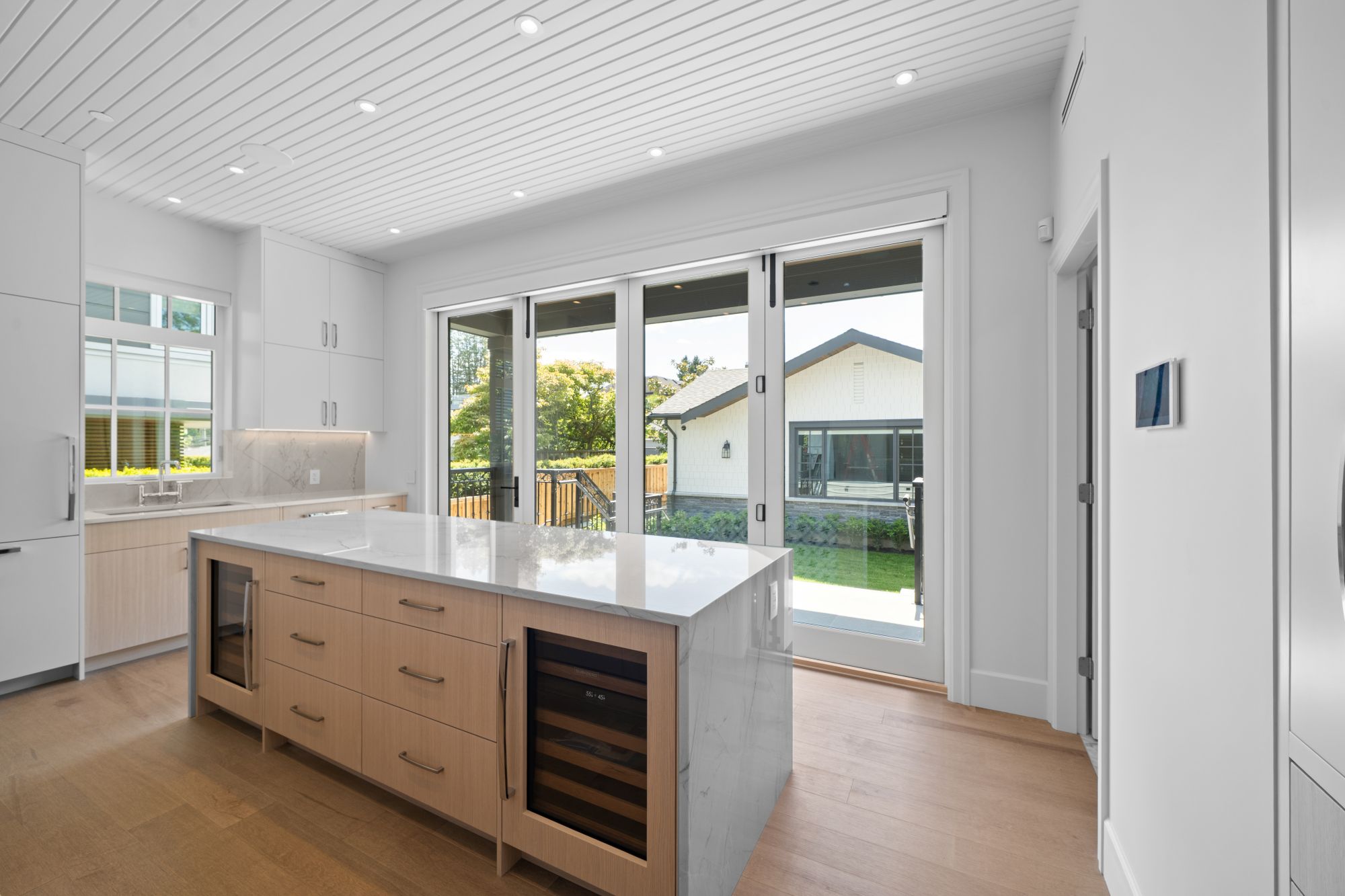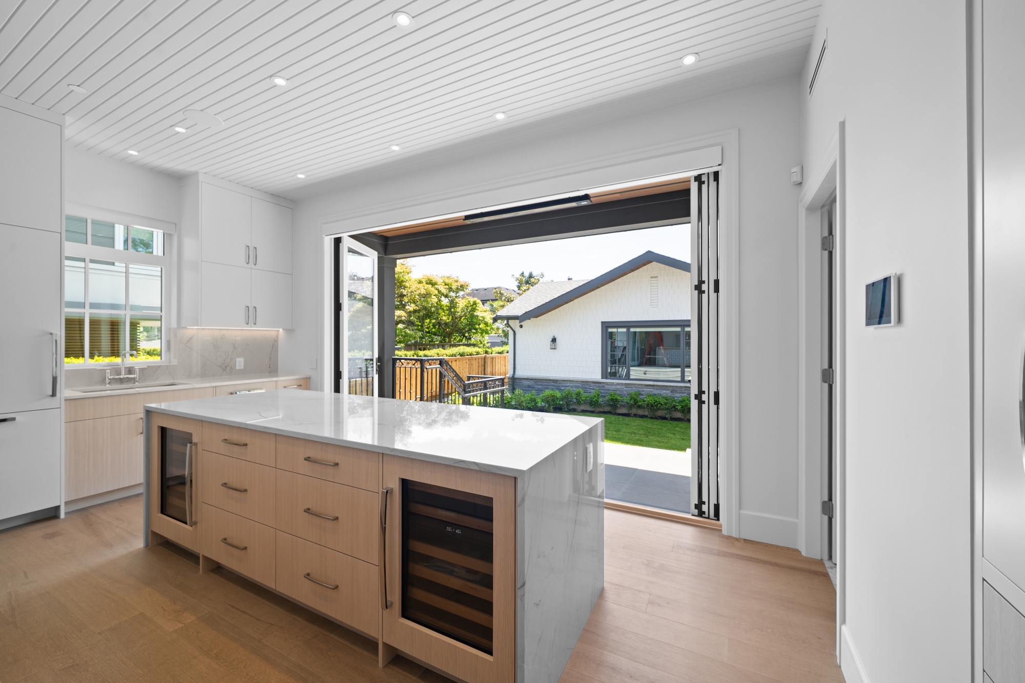 - A large accordion door opening the kitchen to the backyard, flooding the space with natural light and creating a seamless indoor-outdoor area for entertaining