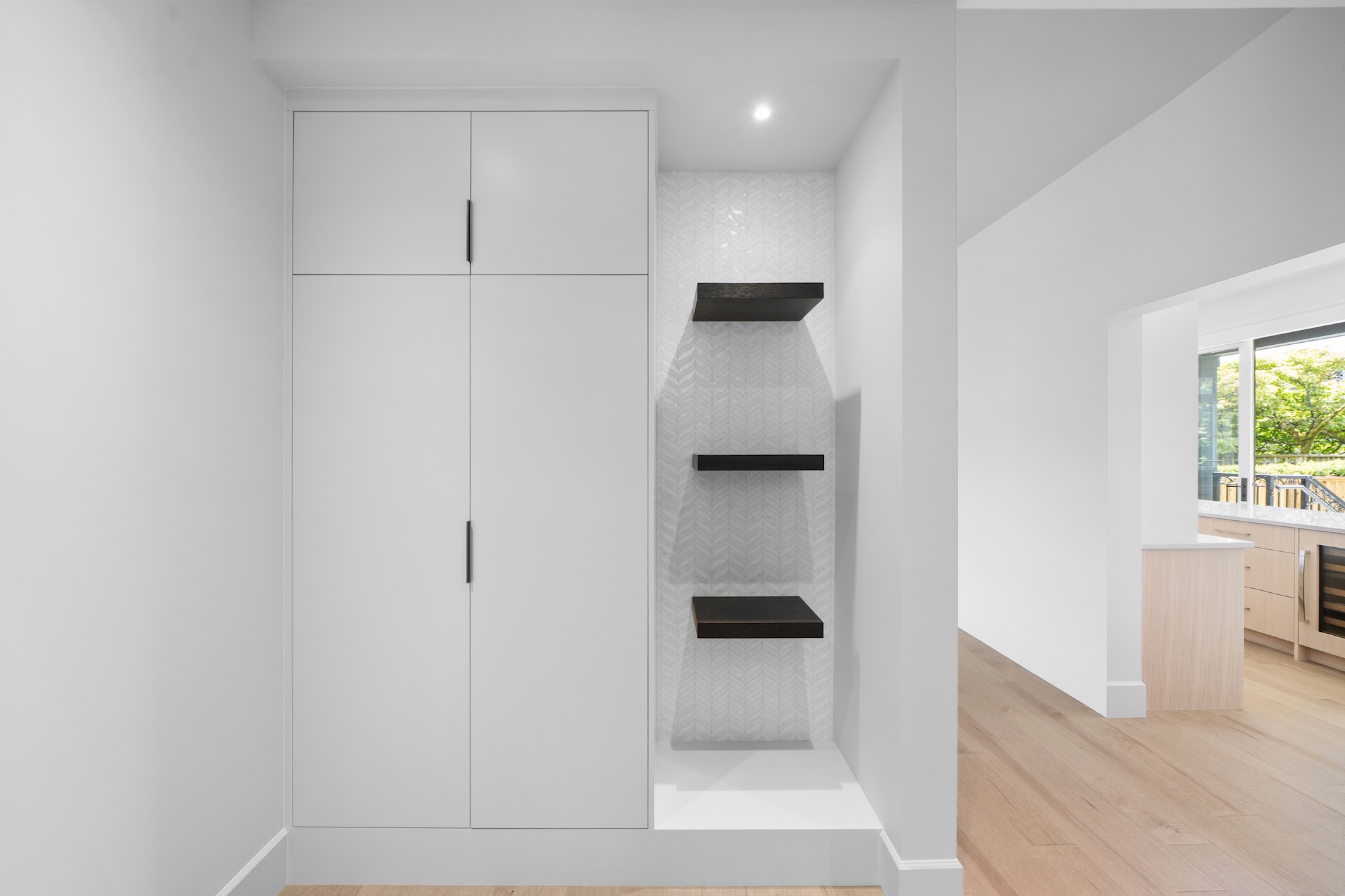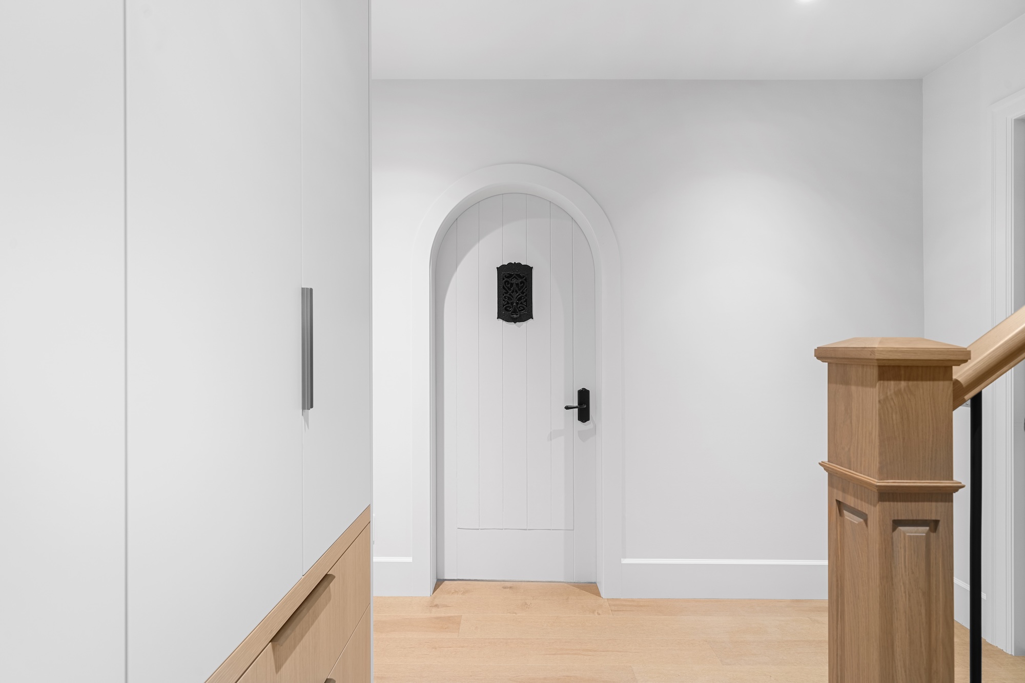 - Custom white oak millwork throughout the home, including seamless entry storage and hidden doors
