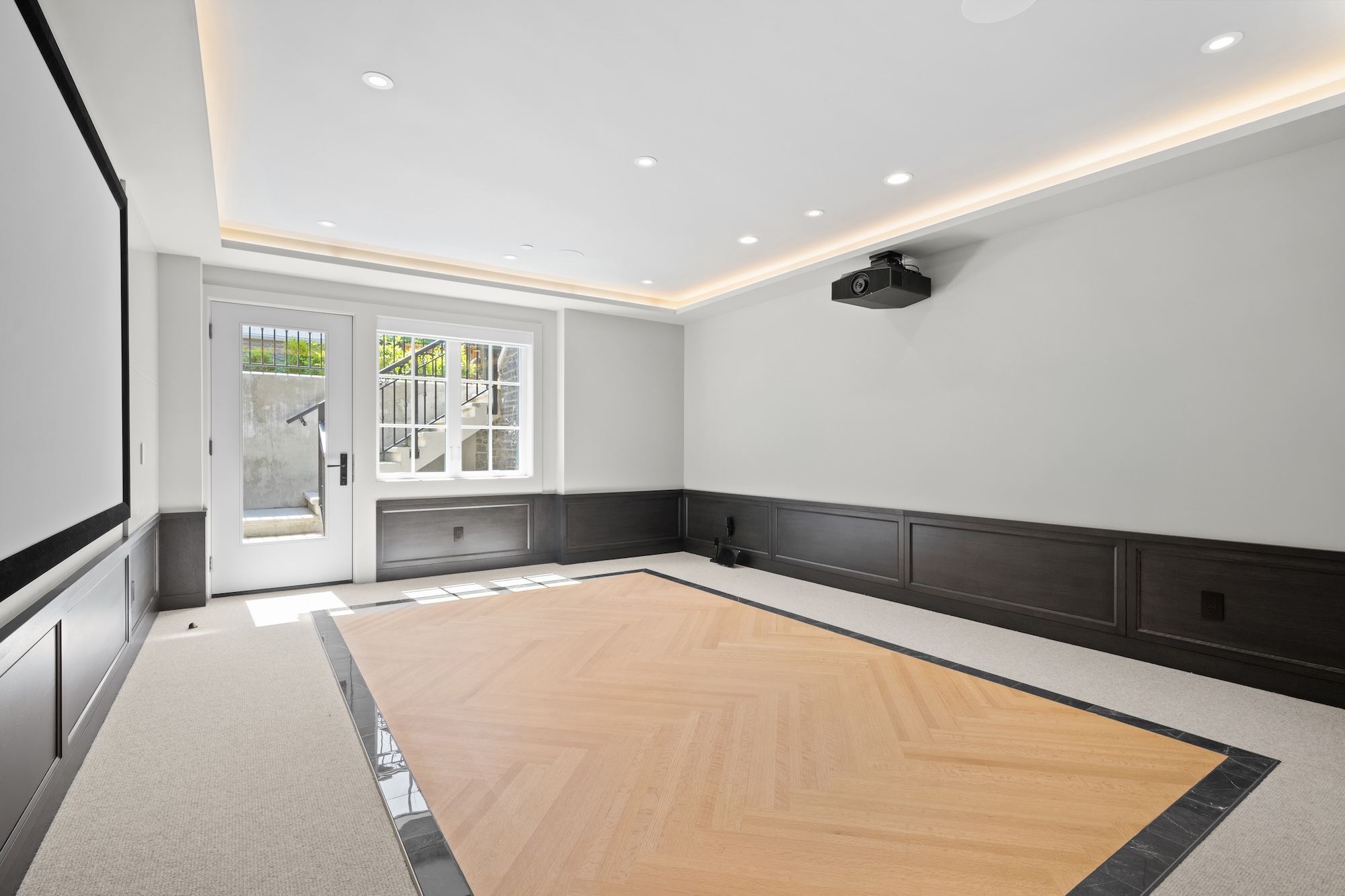 - Chevron-patterned wood flooring in the media room, bordered with wood reclaimed from the original house
